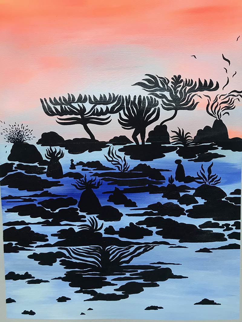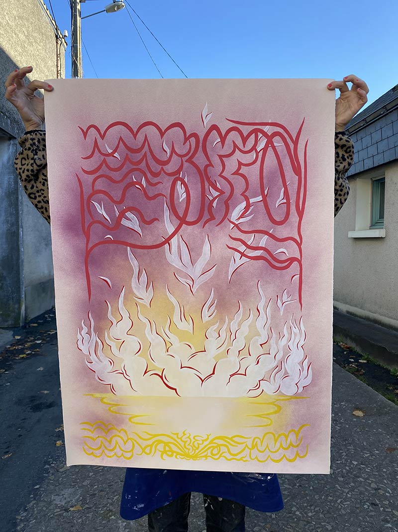 Série de peintures et sérigraphie sur textile qui rassemble une famille de représentations d'extraits de paysages-événement.